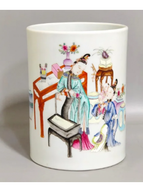 粉彩妇人教子图笔筒