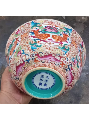 清代大清雍正年制粉彩鱼莲纹陶瓷大碗