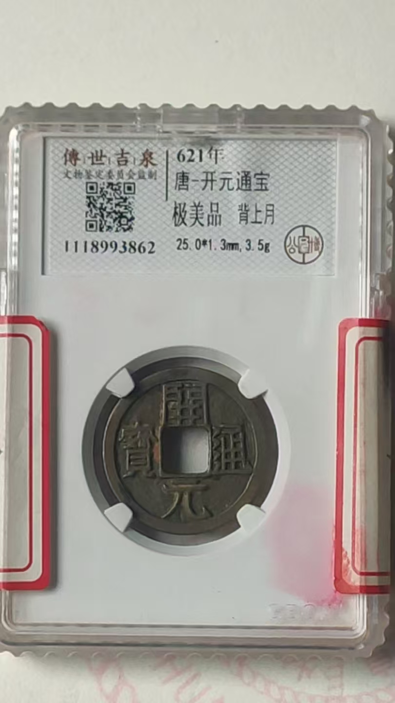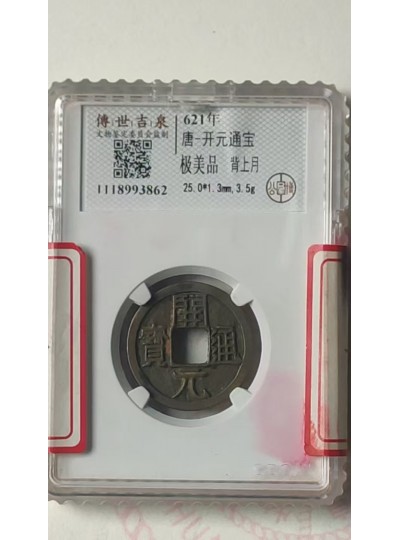 藏品名称:唐 开元通宝背上月 参考价格:250000.00 藏品规格: 藏品款识:唐 开元通宝背上月 藏品类别:钱币