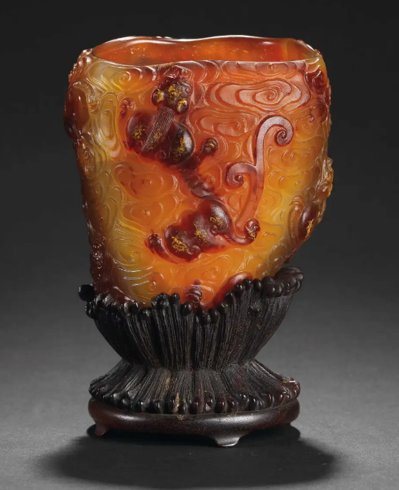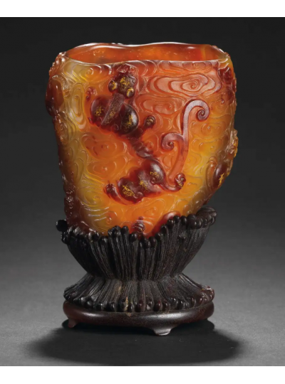 藏品名称:玛瑙仿犀角祥云龙纹杯 参考价格:80000.00 藏品规格: 藏品款识: 藏品类别:微拍