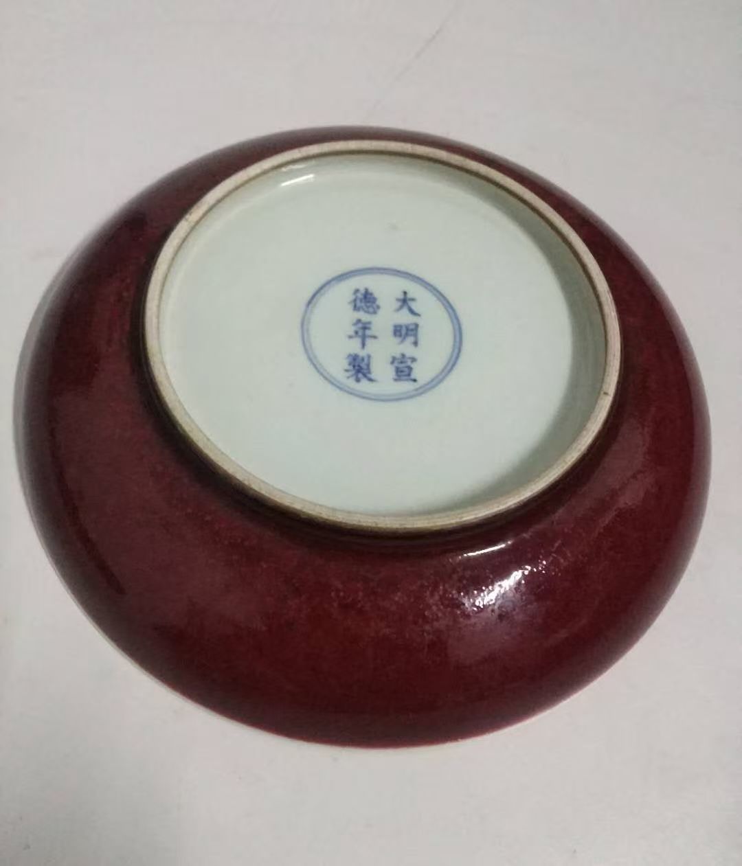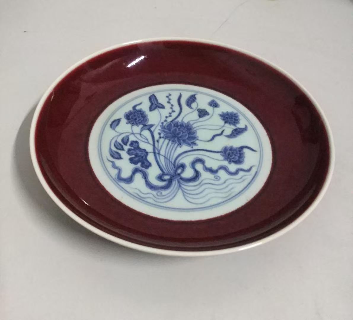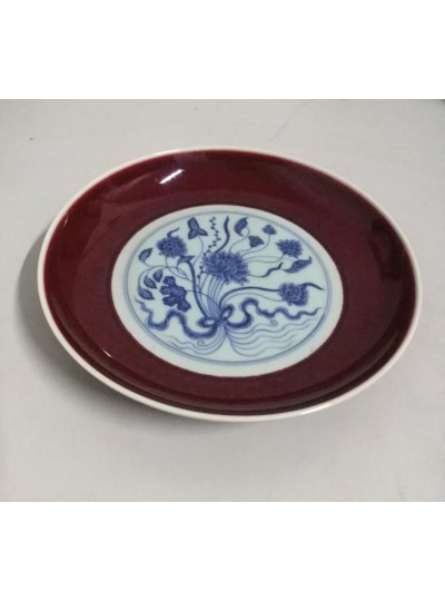 藏品名称:大明宣德 霁红釉青花一束莲赏盘 参考价格:520000.00 藏品规格: 藏品款识: 藏品类别:微拍