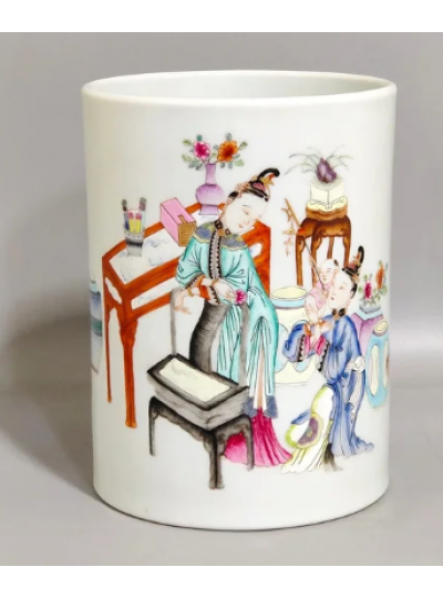 藏品名称:粉彩妇人教子图笔筒 参考价格:290000.00 藏品规格: 藏品款识: 藏品类别:微拍