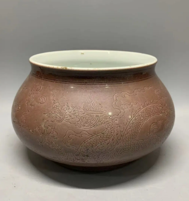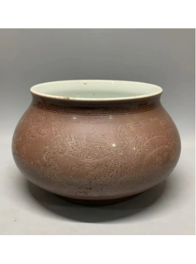藏品名称:紫金釉龙纹鱼篓尊 参考价格:420000.00 藏品规格: 藏品款识: 藏品类别:微拍