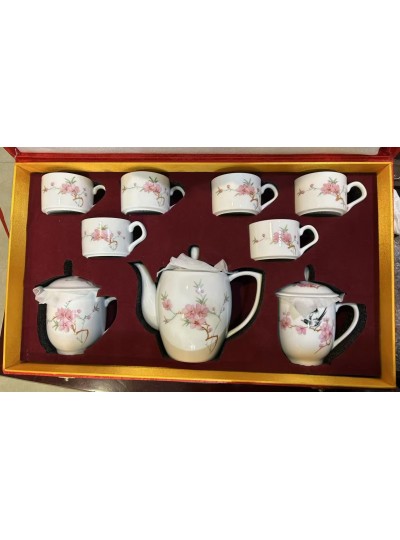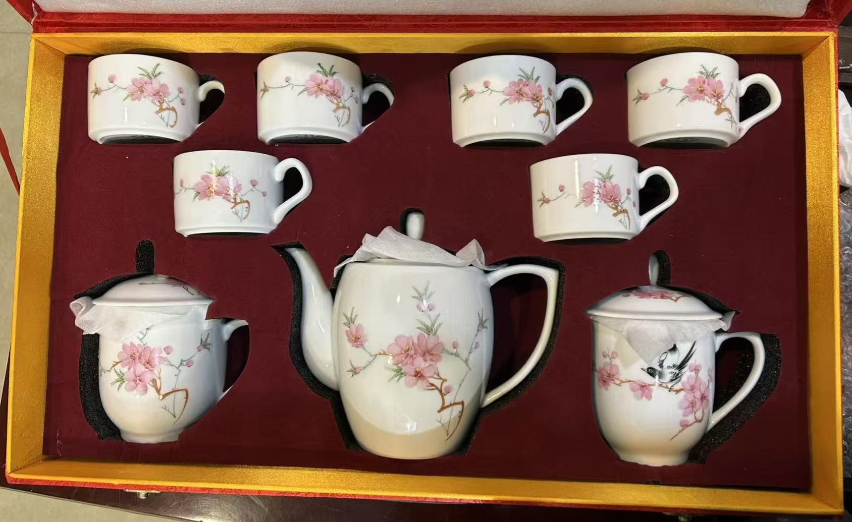 藏品名称:毛瓷水点桃花陶瓷套装 参考价格:780000.00 藏品规格: 藏品款识:毛瓷水点桃花陶瓷套装 藏品类别:瓷器