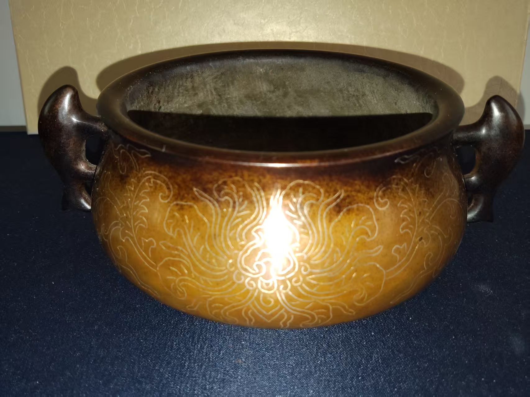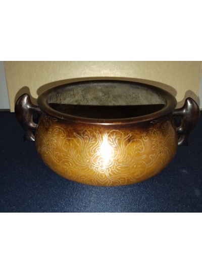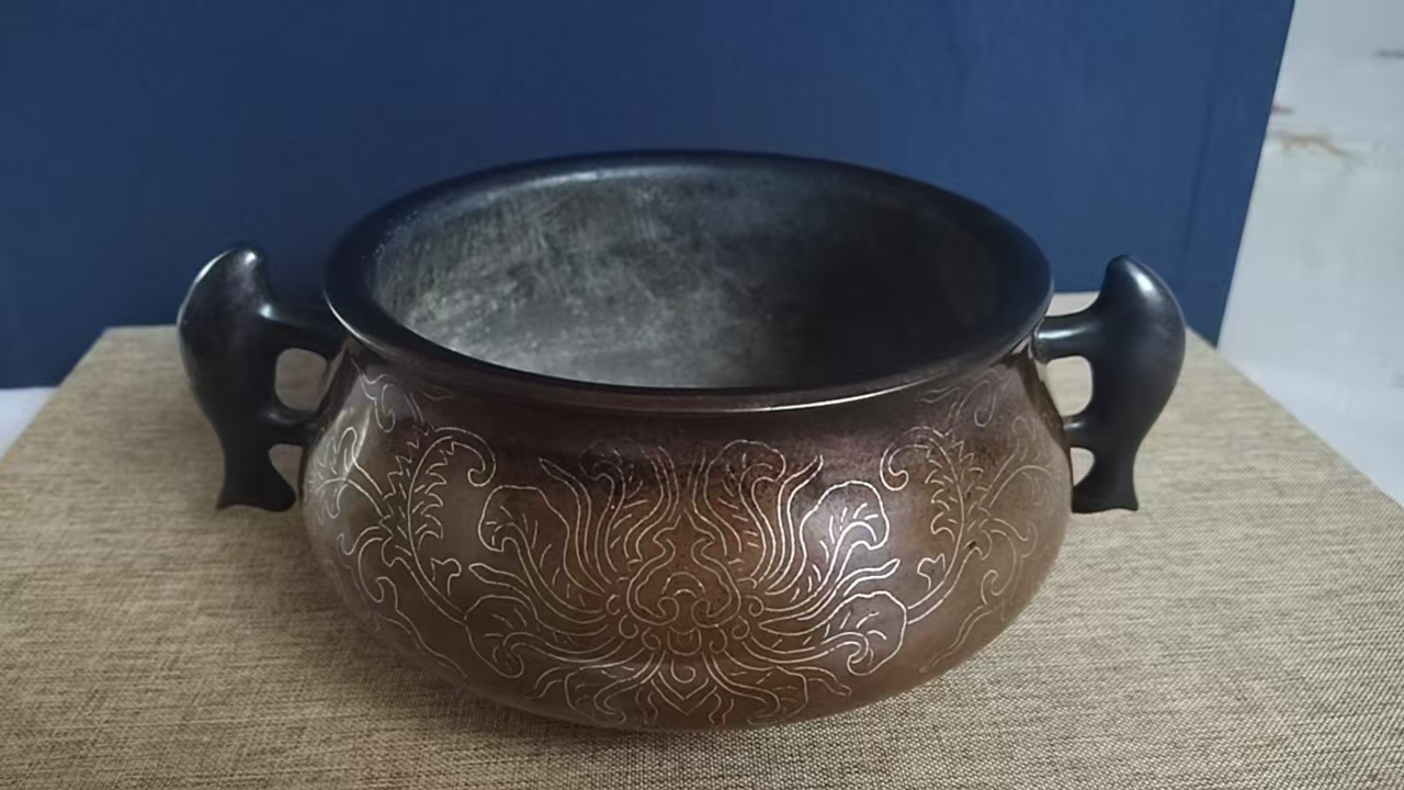 嵌银丝双鱼耳铜炉