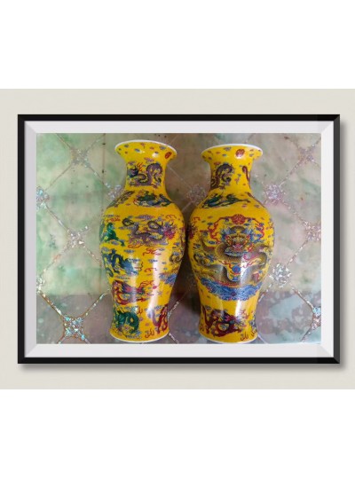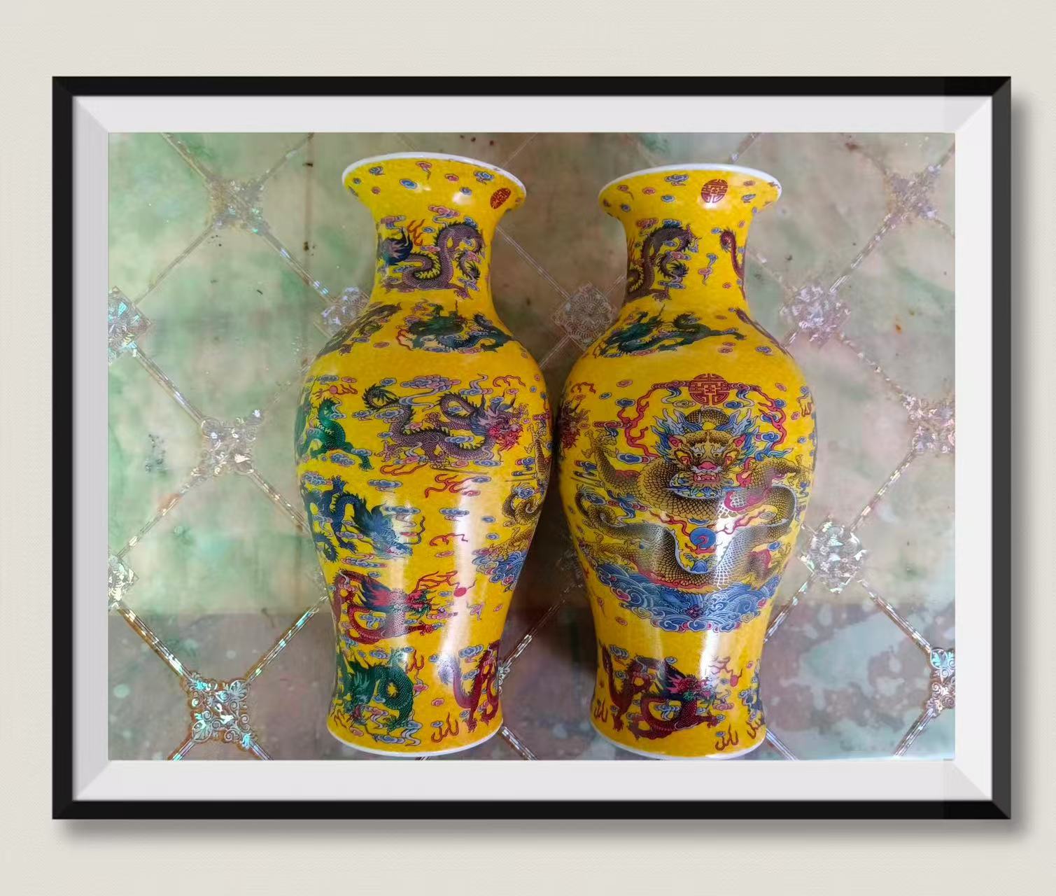藏品名称:黄地粉彩九龙瓶一对 参考价格:1080000.00 藏品规格: 藏品款识:珐琅彩九龙纹瓶一对 藏品类别:瓷器