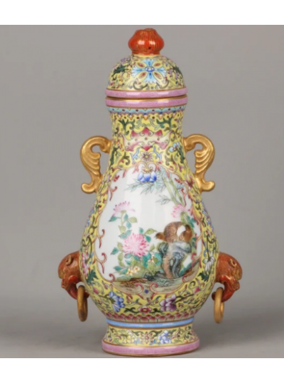 藏品名称:清乾隆官窑珐琅彩鎏金花鸟纹双耳盖罐一对 参考价格:960000.00 藏品规格: 藏品款识: 藏品类别:微拍