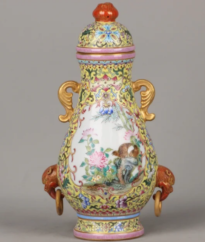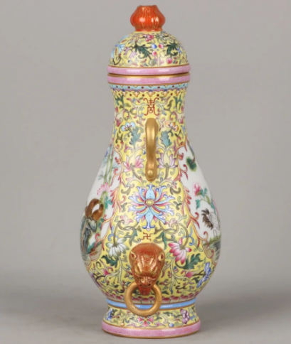 清乾隆官窑珐琅彩鎏金花鸟纹双耳盖罐一对